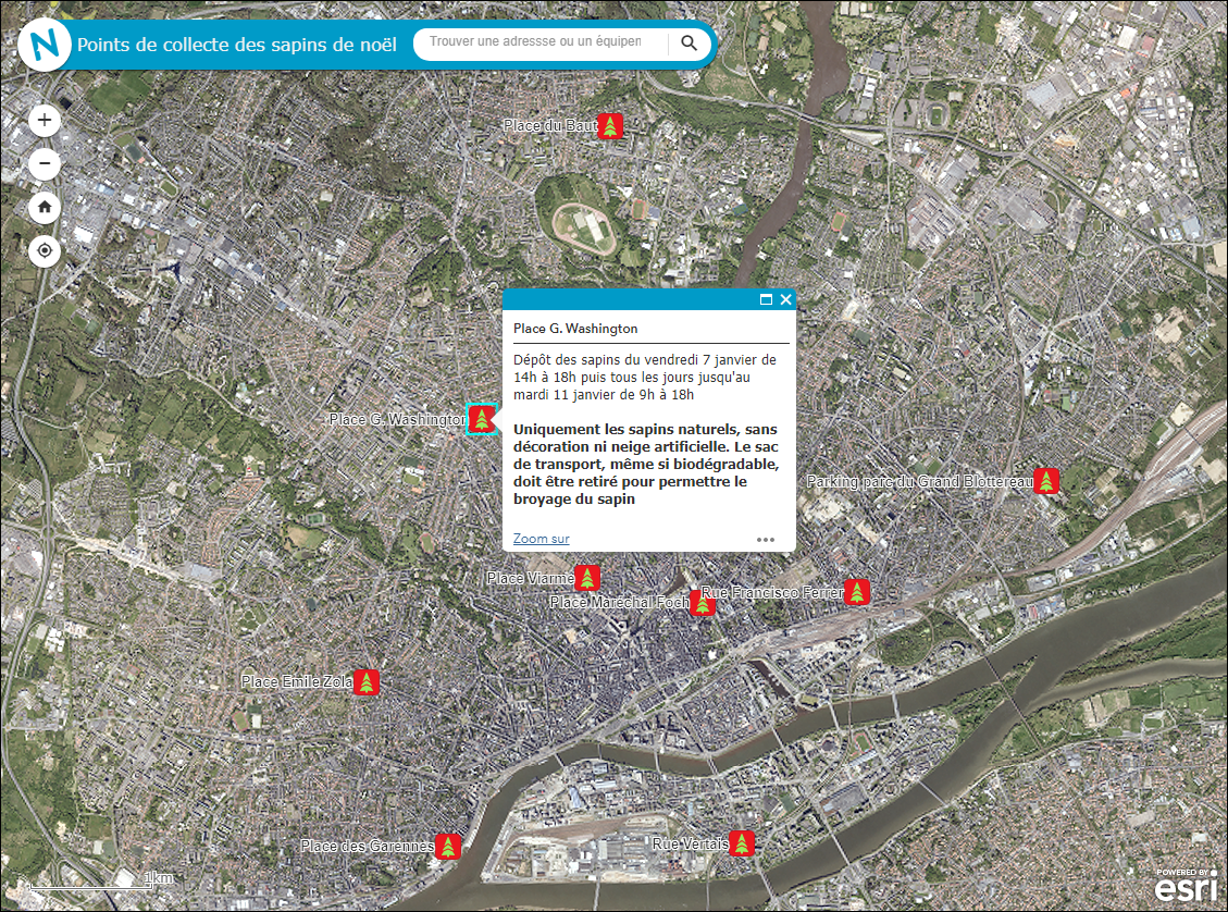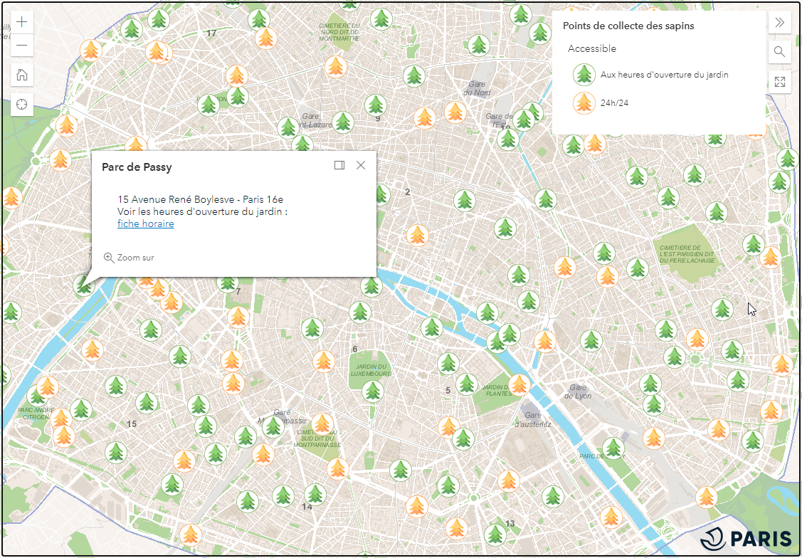 Traversons le périphérique et retrouvons une seconde application permettant aux citoyens de localiser les points de collecte à sapins.Le modèle ArcGIS Web AppBuilder a été sélectionné afin de proposer, comme pour la ville de Paris, une application simple, dépourvue d'outils inutiles. La présentation choisie est celle par onglets.