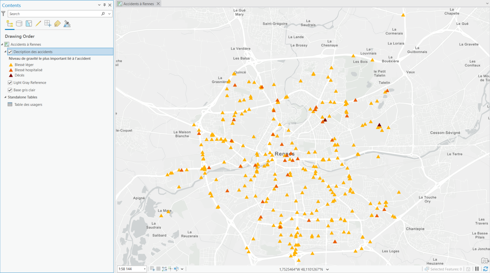 De plus, un projet ArcGIS Pro déjà configuré est intégré à la ressource. L'utiliser vous permettra d'obtenir automatiquement une carte présentant les accidents, symbolisés en fonction de leur niveau de gravité.
